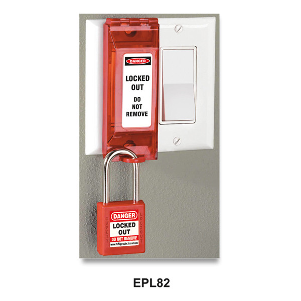 Wall Switch Lockout - Side Hinge Device is used to lockout wall-mounted switches. Easy to install using existing screws. High visibility red colour. Locks switch in "on" or "off" position. Clear poly carbonate lockout uses existing wall plate screws to mount. Hinge & non-hinge pattern.