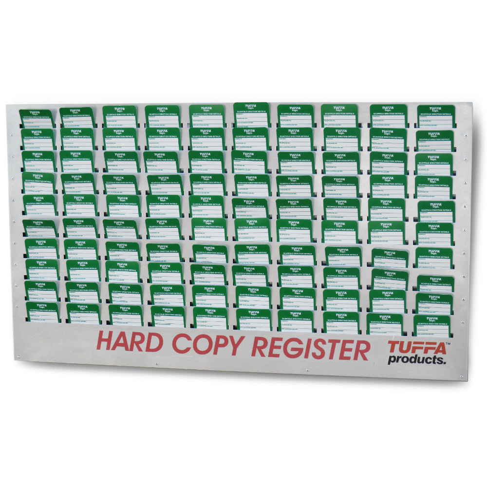 Scaffold Hard Copy Register Board SKU: SC07 Stock Status: Backorder Item $1,078 Including Tax: $98 Description Product Information: Hard Copy Register Board by TUFFA Products. Duplicate copy of Scaffold Tags can held in the office allowing for greater site trace ability. Made from a strong aluminum construction to hold up to 100 Tags, which are included. Dimensions: 1060mm x 600mm x 35mm
